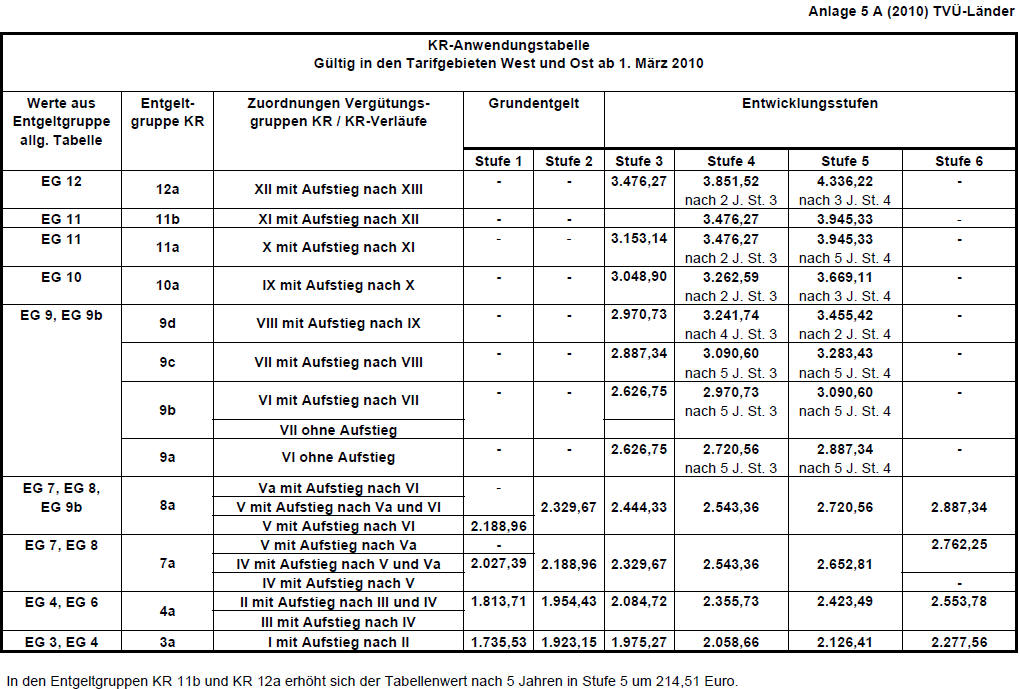 In den Entgeltgruppen KR 11b und KR 12a erhöht sich der Tabellenwert nach 5 Jahren in Stufe 5 um 200 Euro.